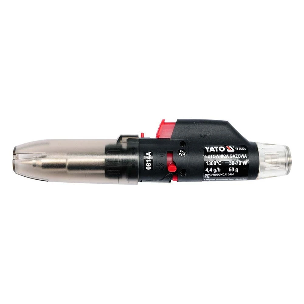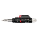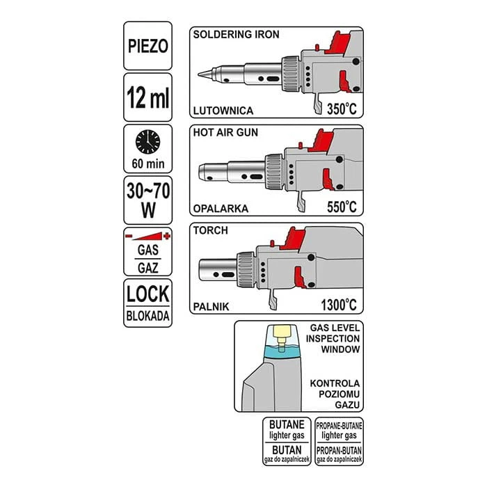 Lutownica gazowa 3 w 1 z zapłonem piezo zasilana gazem zapalniczkowym - butanem o mocy 30-70W. Posiada funkcję lutownicy (max temp 350º C), opalarki (max temp 550º C) oraz palnika (max temp 1300º C). Pojemność zbiornika wynosi 12ml. co pozwala na pracę do 60min. Okienko inspekcyjne w korpusie umożliwia kontrolę poziomu gazu.