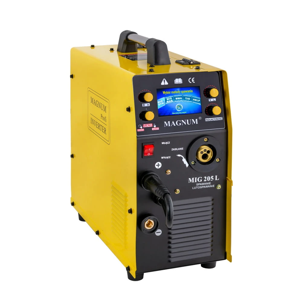 MIG 205 L firmy MAGNUM jest profesjonalnym półautomatem spawalniczym przeznaczonym do spawania stali niskowęglowej, niskostopowej (MAG), stali stopowych (MIG), aluminium i jego stopów oraz do lutospawania!!! Posiada również możliwość spawania elektrodami otulonymi (rutylowe, zasadowe, kwaśne - MMA), a także drutami samoosłonowymi (spawanie "bez gazu"). Urządzenie to znajduje zastosowanie w ciężkich warunkach produkcyjnych (przemysłowych), jak i w warsztatach naprawczych. Przystosowane jest do zasilania z sieci 230 V, 50 Hz. MIG 205 L posiada profesjonalny podajnik drutu, gniazdo "euro złącze", co umożliwia zastosowanie różnych typów uchwytów spawalniczych oraz wyjście na podgrzewacz gazu. Urządzenie to wyposażone jest w przeciążeniowy układ zabezpieczenia termicznego, zapobiegający nadmiernemu przegrzewaniu się.