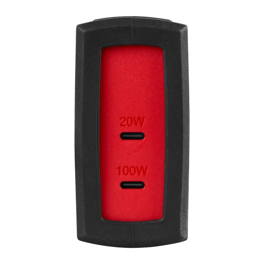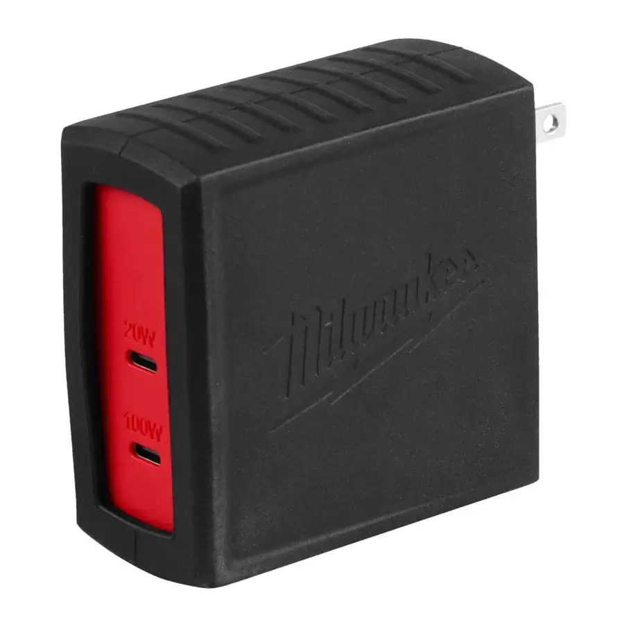 Milwaukee TC-USBC100 to sieciowy adapter USB-C do gniazdka 230 V z dwoma portami USB-C, umożliwiający jednoczesne ładowanie dwóch urządzeń z łączną mocą do 120 W. Port główny dostarcza do 100 W, a dodatkowy do 20 W, dzięki czemu sprawdzi się zarówno do telefonów i tabletów, jak i do laptopów czy oświetlenia osobistego. Adapter może także zasilać miniładowarkę M18 TC (M18 Top-Off), zapewniając jej maksymalną wydajność podczas ładowania akumulatorów.