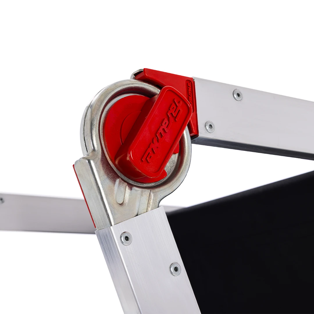 Podest Faraone PLS5 oparty jest na wytrzymałych profilach aluminiowych usztywnionych krzyżowymi stabilizatorami. Antypoślizgowe stopnie są trwale zamocowane techniką nitowania stosowaną w przemyśle lotniczym, co gwarantuje długotrwałą stabilność połączeń. Zintegrowane barierki ochronne oraz bortnice platformy zabezpieczają użytkownika i materiały przed ześlizgnięciem się z podestu. Konstrukcja spełnia wymagania norm EN 131 oraz EN 131-7.