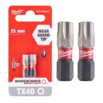 Bit udarowy TORX T40x25mm Milwaukee SHOCKWAVE / x2 to wysokiej jakości akcesorium do wkrętarek udarowych, zaprojektowane z myślą o wydajności i trwałości. Bit udarowy TORX T40x25mm Milwaukee SHOCKWAVE / x2 charakteryzuje się specjalną geometrią końcówki, która zapewnia lepsze dopasowanie do śruby i redukuje ryzyko poślizgu.