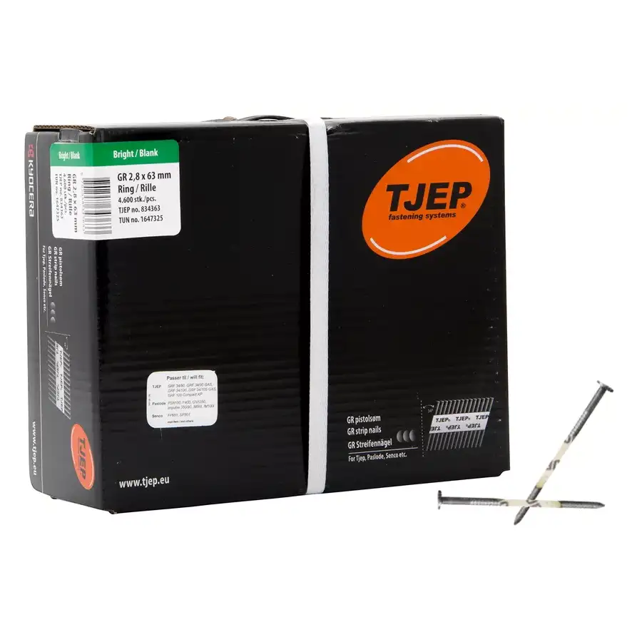 Gwoździe pierścieniowe GR 28/63 (łączone papierem) marki Tjep przeznaczone są do pracy w gwoździarkach. Wykonane w czarnym wykończeniu, cechują się wysoką wytrzymałością i odpornością na łamanie, dzięki czemu znajdują szerokie zastosowanie w budownictwie oraz przy różnego rodzaju konstrukcjach.