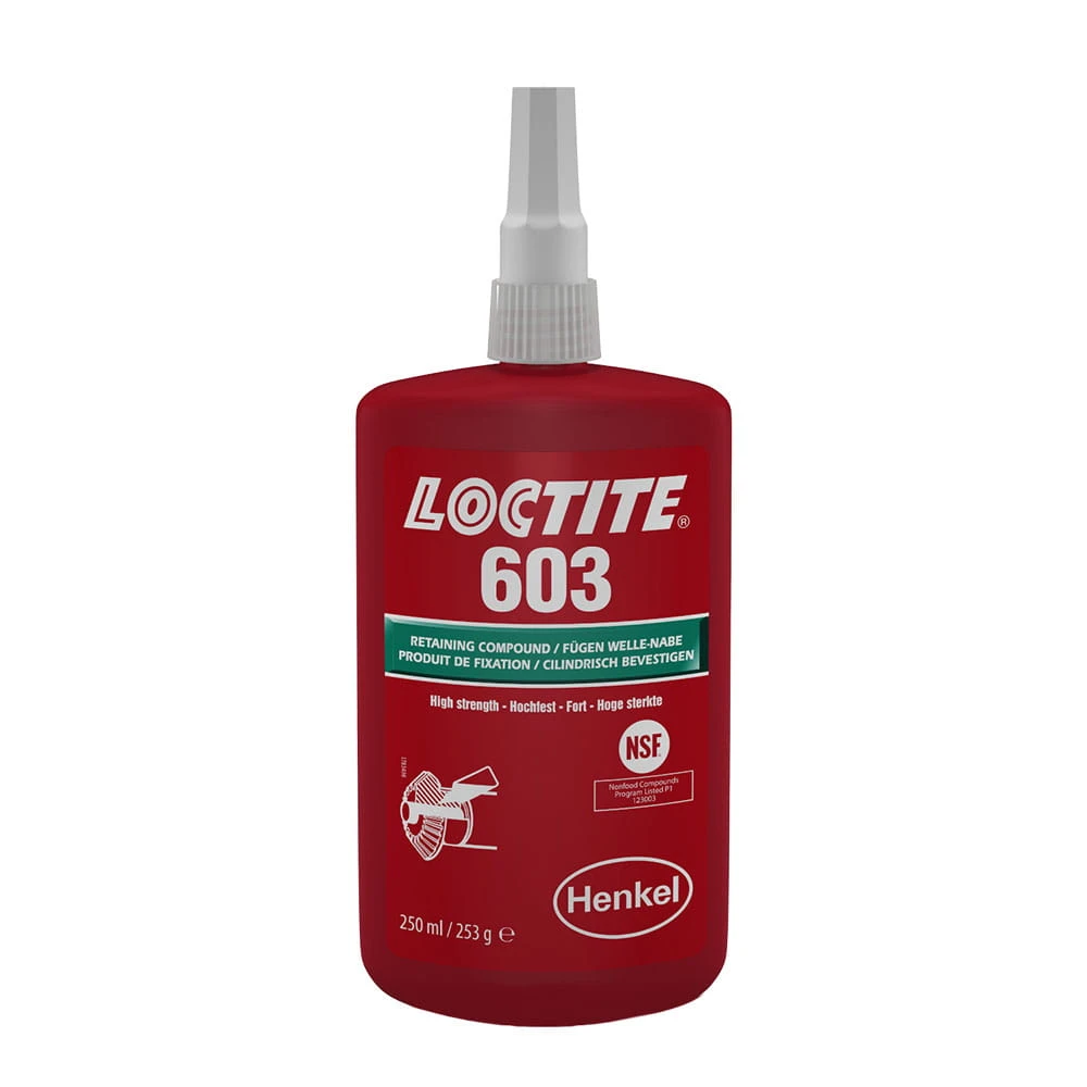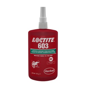 LOCTITE 603 to jednoskładnikowy, metakrylanowy klej anaerobowy stworzony do mocowania części współosiowych. Po utwardzeniu tworzy wytrzymałe połączenie, zabezpieczając łożyska na wałach lub w gniazdach przed obróceniem oraz wypracowaniem spowodowanym przez drgania, wibracje, różnice temperaturowe i nierównomierne rozłożenie naprężeń. Klej ten również chroni przed korozją cierną.