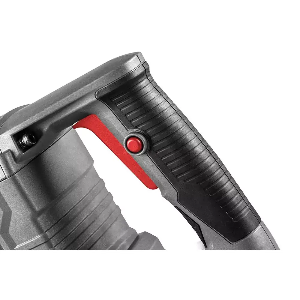 Urządzenie wykorzystuje uchwyt narzędziowy sześciokątny 30 mm, zalecany do pracy z twardymi materiałami. Antypoślizgowe wykończenie poprawia pewność chwytu, a dodatkowa rękojeść z regulacją ustawienia pod dowolnym kątem pozwala wygodnie dopasować pozycję podczas pracy, zwiększając komfort i bezpieczeństwo. Obsługę ułatwia włącznik czteropalcowy oraz blokada do pracy ciągłej, przydatna przy dłuższych zadaniach.