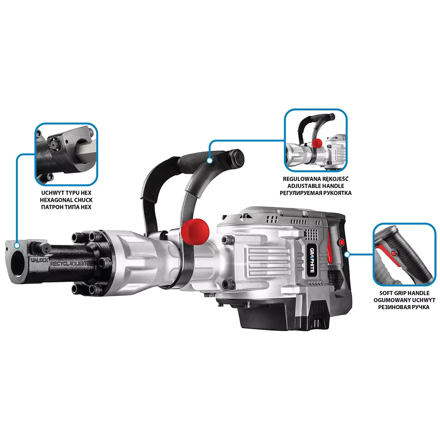 Młot wyburzeniowy GRAPHITE o mocy 1700 W to narzędzie stworzone do ciężkich prac instalacyjnych i rozbiórkowych. Oferuje energię udaru na poziomie 45 J oraz częstotliwość 1500 ud./min, co przekłada się na wysoką skuteczność podczas kucia i wyburzania. Korpus przekładni wykonano ze stopu aluminium odpornego na uszkodzenia i wysokie temperatury, co wzmacnia konstrukcję przy intensywnej eksploatacji.