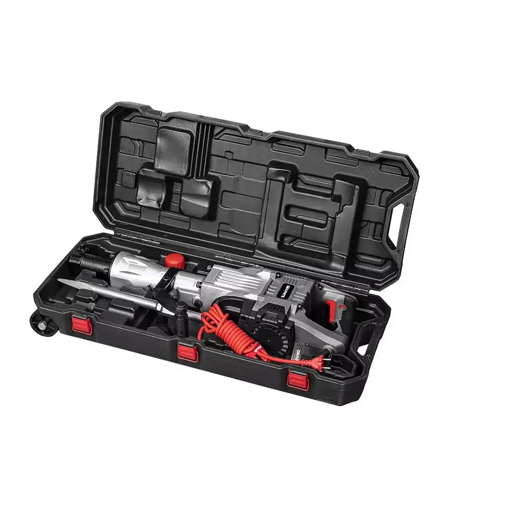 Młot wyposażono w elastyczny, wytrzymały przewód w gumowej osłonie o długości 4 m, przygotowany do zastosowań profesjonalnych i przemysłowych – zarówno wewnątrz, jak i na zewnątrz. W komplecie znajduje się walizka oraz akcesoria: dłuto, osłona przeciwpyłowa i zasobnik ze smarem. Zgodność z normami europejskimi potwierdza certyfikat CE.