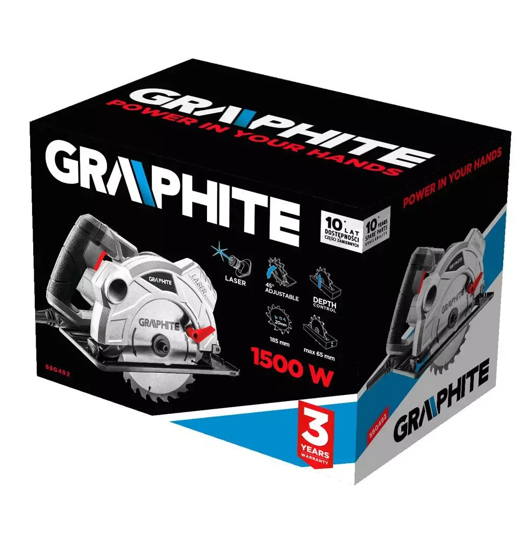 Model współpracuje z tarczami o wymiarach 185 x 20 mm. Obudowa wykonana ze stopu aluminium zwiększa trwałość, a zintegrowany laser (<1mW) ułatwia wyznaczanie linii i kierunku cięcia. Dołączona prowadnica równoległa pozwala prowadzić pilarkę stabilnie wzdłuż krawędzi materiału, co poprawia precyzję. Urządzenie posiada 2-metrowy przewód zasilający w gumowej powłoce oraz certyfikat CE.