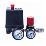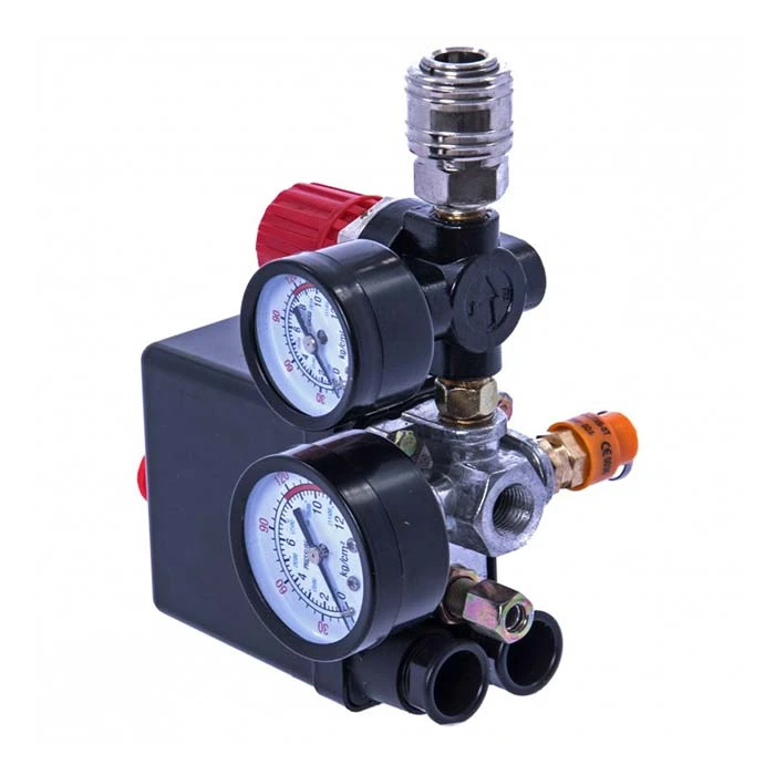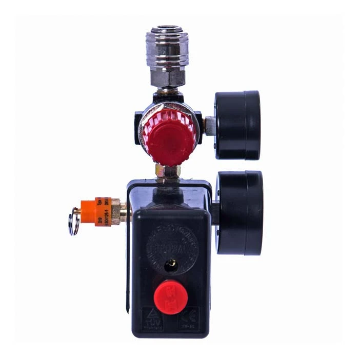 Presostat wyposażony w reduktor z szybkozłączem, służący do regulacji ciśnienia wyjściowego oraz zawór bezpieczeństwa zapobiegający przekroczeniu maksymalnego ciśnienia w zbiorniku.