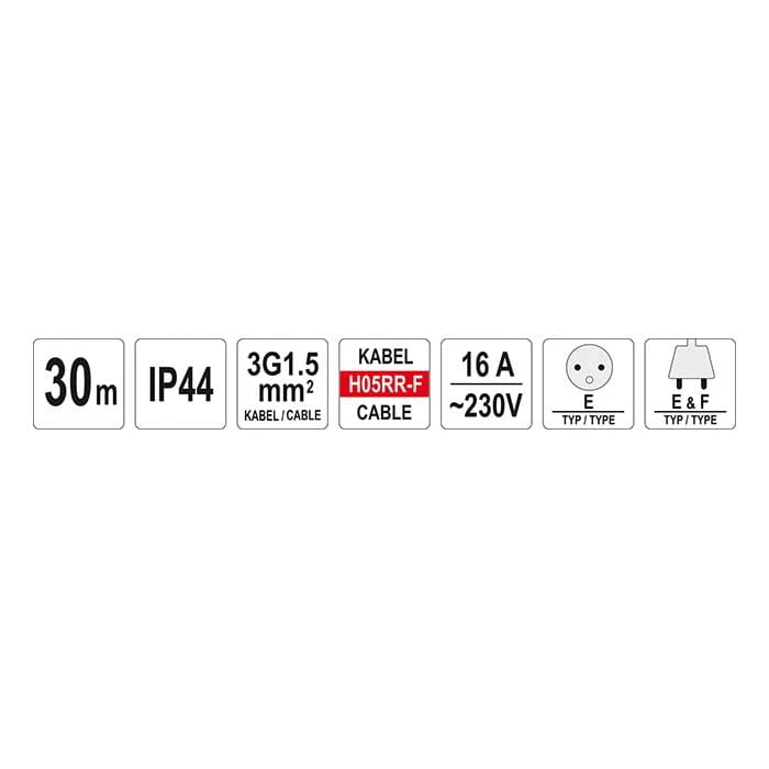 Przedłużacz bębnowy budowlany YT-81053 o długości 30 metrów z 4-ma pyło i bryzgoszczelnymi gniazdami, zabezpieczeniem termicznym oraz zabezpieczeniem przed dziećmi. Przewód w osłonie z gumy naturalnej nawinięty na bęben wykonany z wytrzymałego tworzywa sprawia, że przedłużacz może być stosowany wewnątrz jak i na zewnątrz, np. na budowie, w ogrodzie, na placach przed zakładami produkcyjnymi. Bęben osadzony na solidnym metalowym stelażu z ergonomiczną rękojeścią. Rączka umieszczona przy krawędzi bębna przyspiesza zwijanie, a gumowy element przymocowany do przewodu kilka centymetrów przed wtyczką umożliwia zaczepienie go np. do krawędzi bębna, co znacznie ułatwia przechowanie i transport zwiniętego przedłużacza.