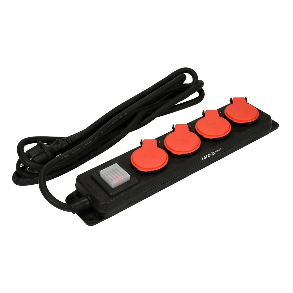 Przedłużacz YT-81241 w formie listwy z czterema gniazdami z uziemieniem. Gruby i solidny przewód w osłonie z gumy neoprenowej sprawia, że przedłużacz może być stosowany wewnątrz jak i na zewnątrz, np. w garażu, na budowie, w ogrodzie czy na placach przed zakładami produkcyjnymi. Szczelna i wytrzymała obudowa oraz pokrywy na gniazda w formie klapek zapewniają bryzgo i pyłoszczelną konstrukcję, a dedykowane otwory montażowe umożliwiają powieszenie przedłużacza np. na ścianie.