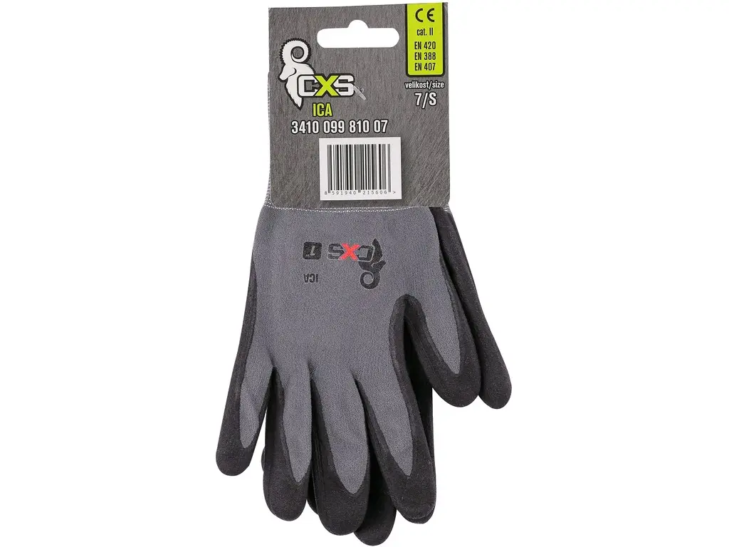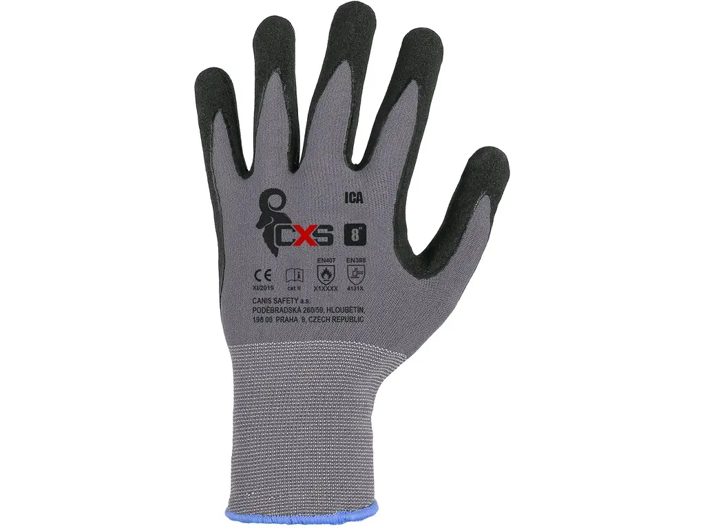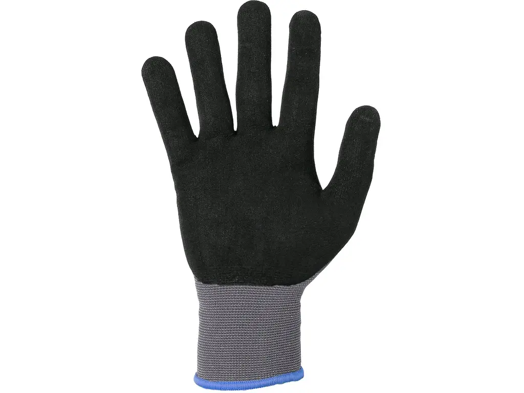 Bezszwowe rękawice z elastycznej dzianiny nylonowej, w połowie powlekane mieszaniną spienionego nitrylu i poli- uretanu na bazie wody, z wykończeniem piaskowym dla wygodniejszego uchwytu, odporność na ciepło kontaktowe do 100°C, elastyczny mankiet. Opakowanie z blistrem. Zalecane zastosowanie: przemysł samochodowy, logistyka, gospodarka magazynowa, praca z gorącymi przedmiotami do 100°C, hobby, manipulacja i praca z śliskimi przedmiotami, ogród, budownictwo, usługi komunalne, montaż i pakowanie małych części.