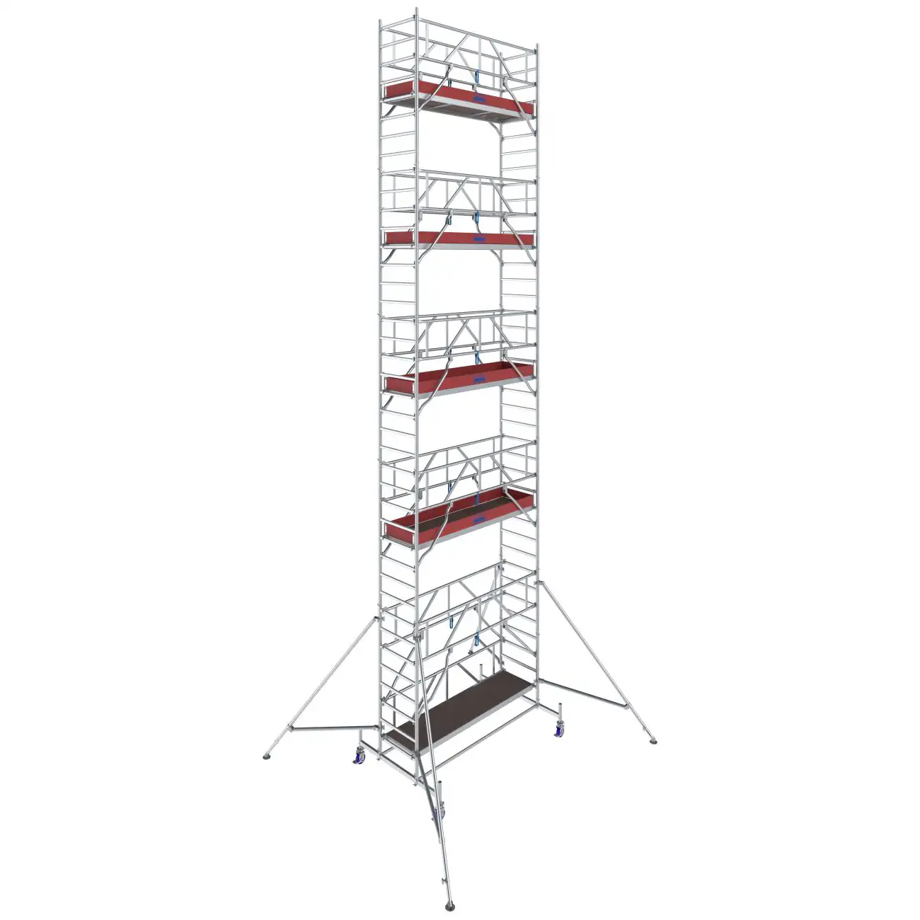 - Łatwe w montażu podpory z bezstopniową regulacją oraz teleskopową stopą (zakres regulacji do 230 mm) zapewniające dodatkową stabilizację i bezpieczne użytkowanie w konstrukcjach od wysokości roboczej 7,40 m
