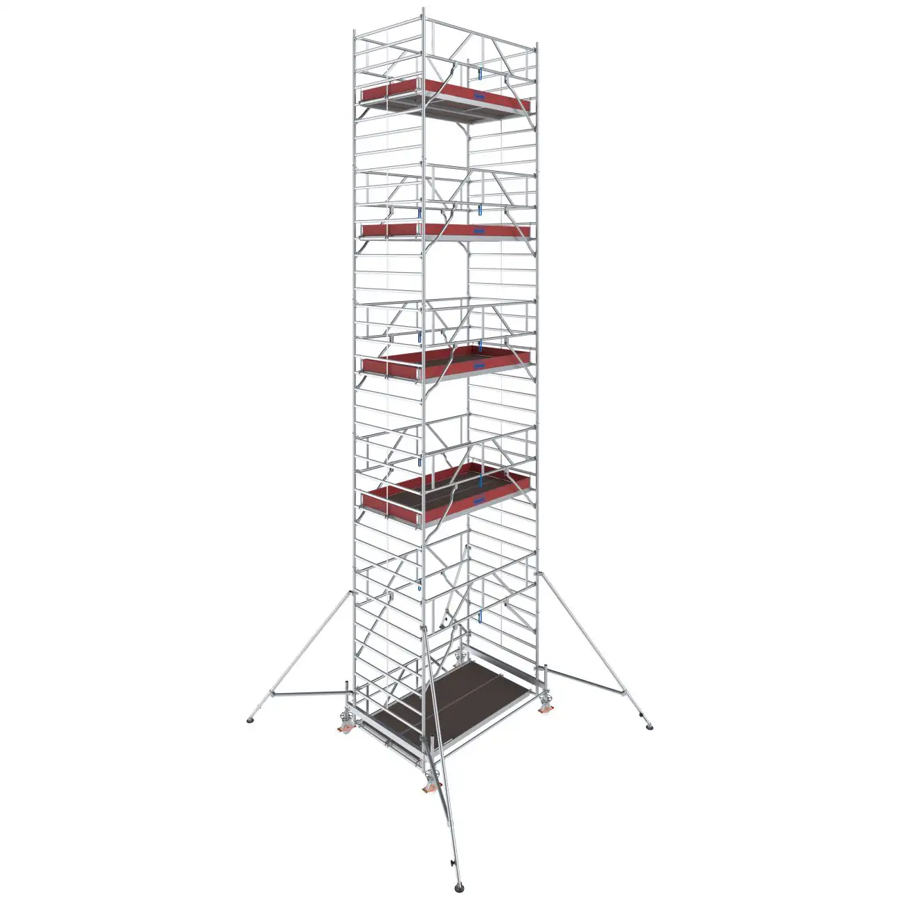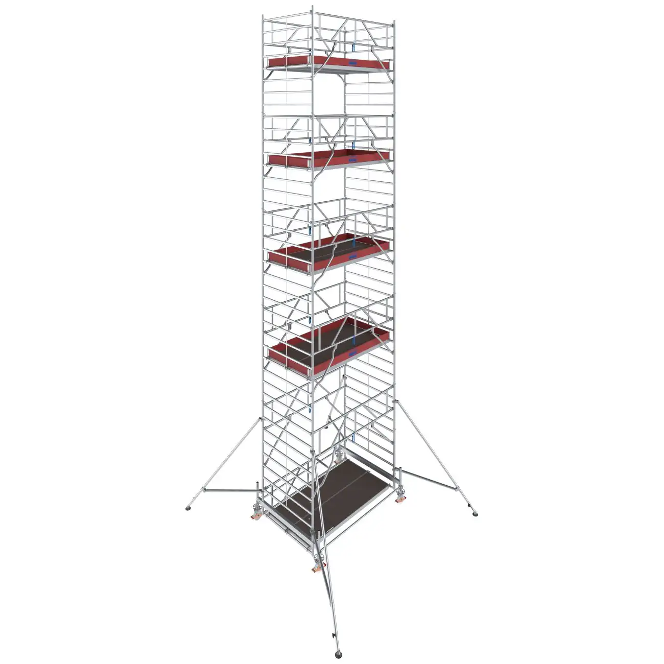 - Łatwe w montażu podpory z bezstopniową regulacją oraz teleskopową stopą (zakres regulacji do 230 mm) zapewniające dodatkową stabilizację i bezpieczne użytkowanie w konstrukcjach od wysokości roboczej 8,50 m