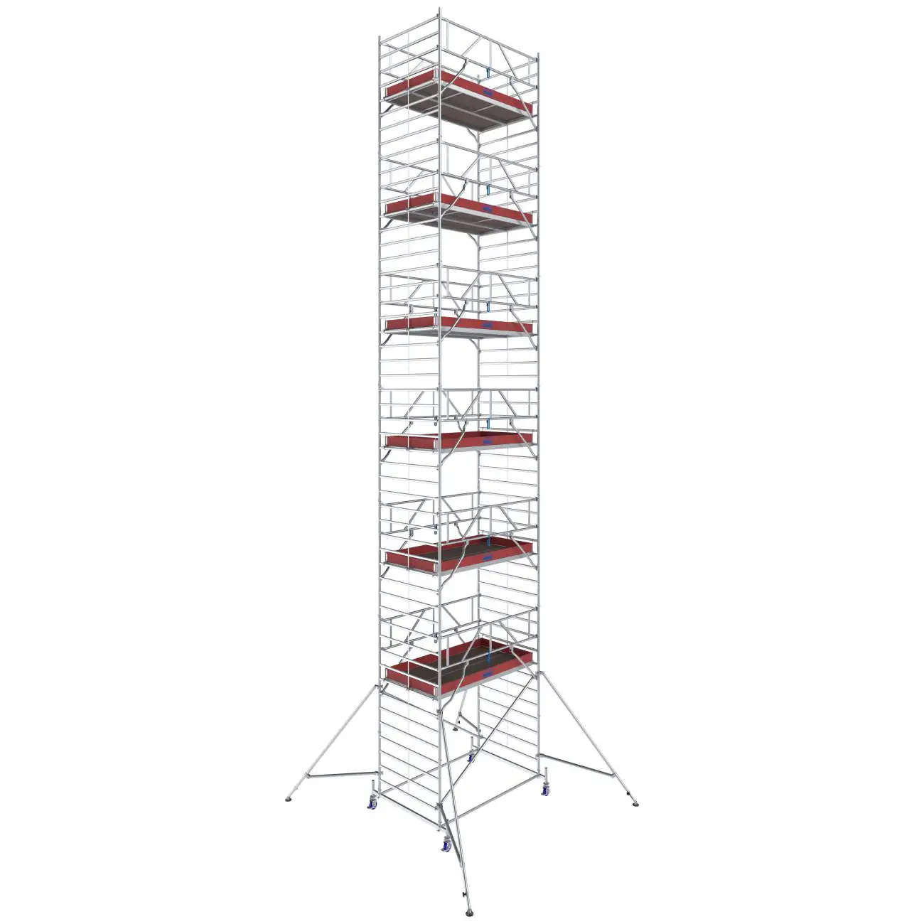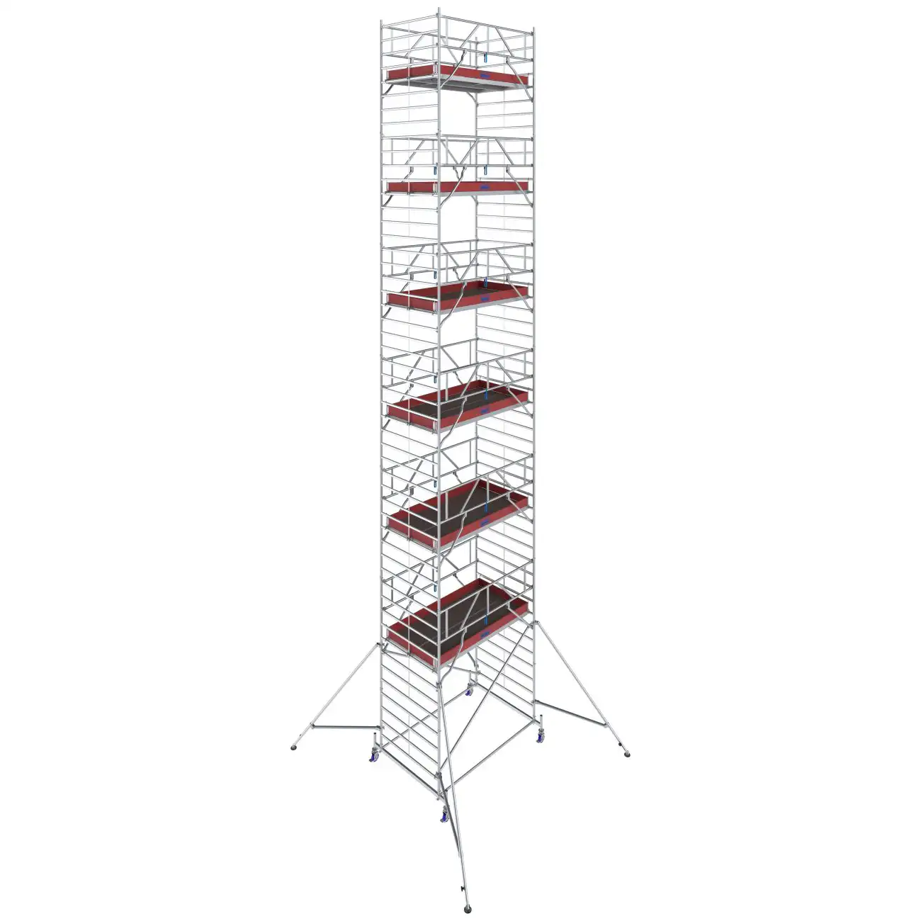 - Łatwe w montażu podpory z bezstopniową regulacją oraz teleskopową stopą (zakres regulacji do 230 mm) zapewniające dodatkową stabilizację i bezpieczne użytkowanie w konstrukcjach od wysokości roboczej 6,40 m