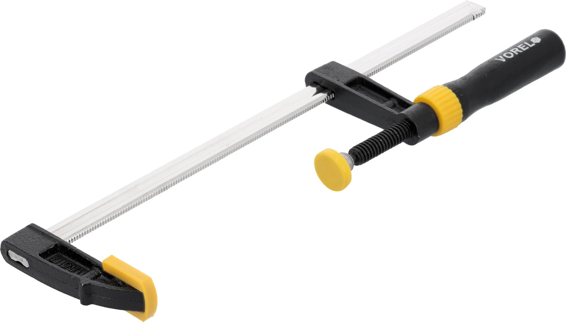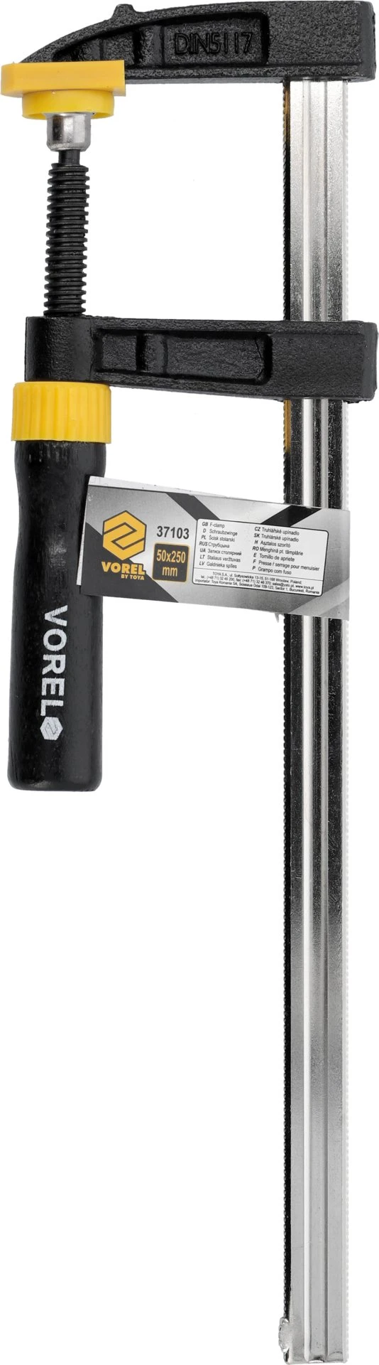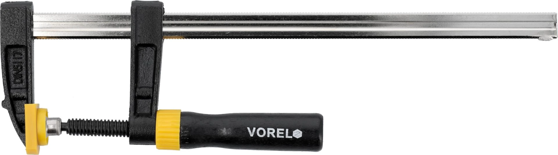 Ścisk stolarski Vorel o wymiarach 250x50 mm przeznaczony jest do skutecznego mocowania elementów podczas montażu, obróbki i klejenia. Szczęki wykonane są z wytrzymałego żeliwa, a stabilna, cynkowana szyna stalowa i śruba dociskowa z wahliwą płytką zapewniają pewny i równomierny docisk. Lakierowana, drewniana rękojeść z metalową skuwką gwarantuje wygodę i trwałość podczas pracy.