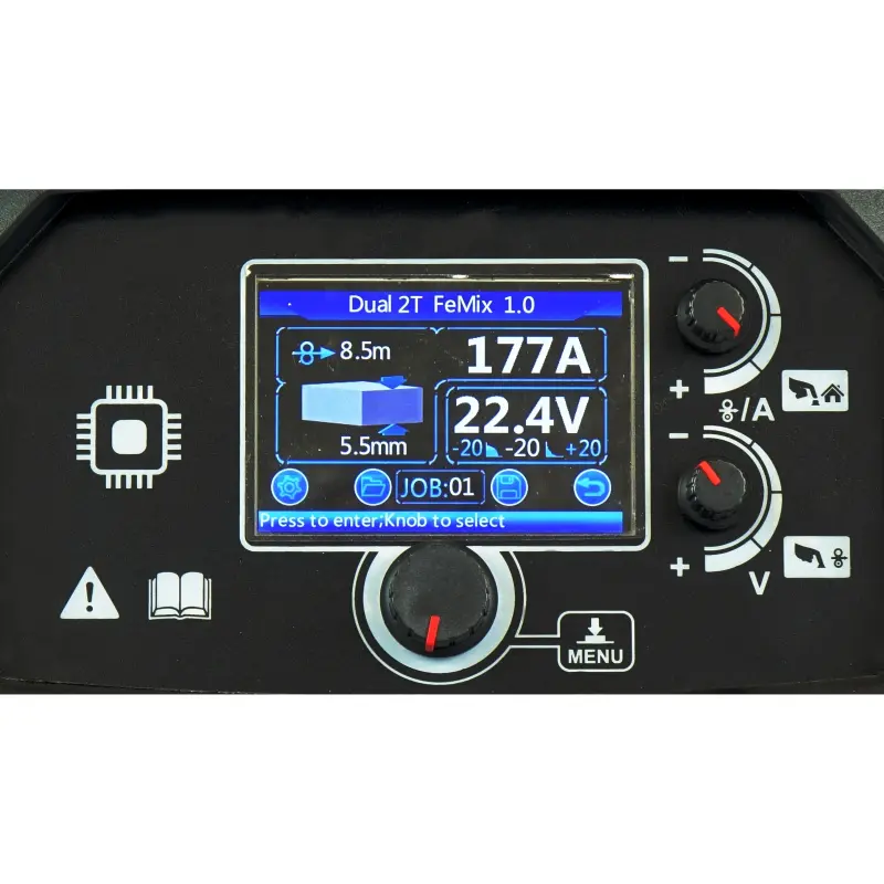 - Rozbudowana regulacja parametrów MIG: indukcyjność, narastanie/opadanie prądu, prąd początkowy i końcowy, upalanie/dojazd drutu, napięcie i częstotliwość pulsacji, czas wypływu gazu
