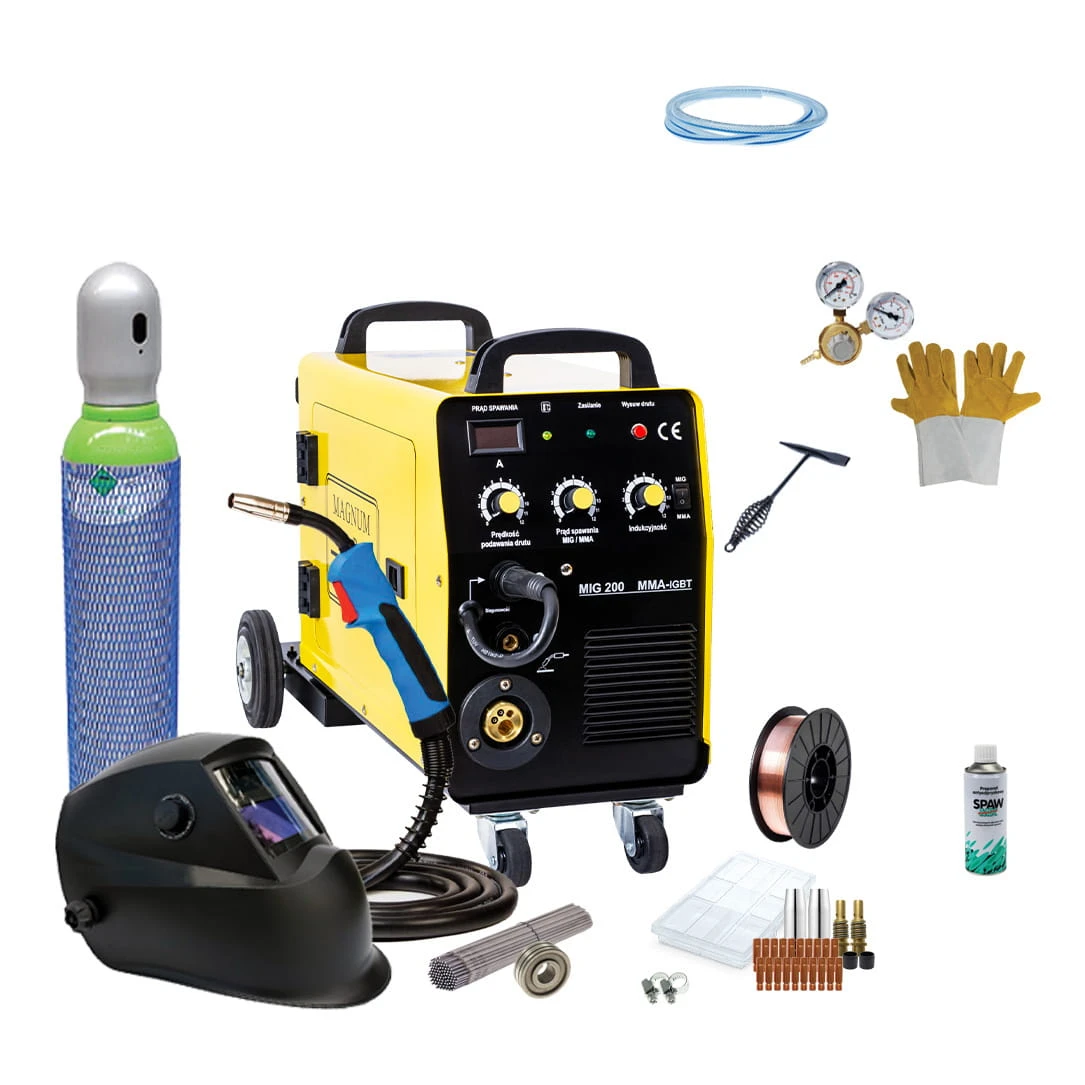Urządzenie marki MAGNUM MIG 200 MMA KN jest półautomatem spawalniczym wykonanym w technologii inwerterowej zasilanym z sieci jednofazowej 230V. Urządzenie umożliwia spawanie łukowe drutem topliwym MIG/MAG, drutem samoosłonowym FCAW (należy zmienić biegunowość w spawarce: minus (-) na uchwycie spawalniczym, plus (+) na masie!), oraz elektrodą otuloną MMA. Przeznaczone jest do wszelkiego rodzaju prac spawalniczych w warsztatach ślusarskich, warsztatach naprawczych.