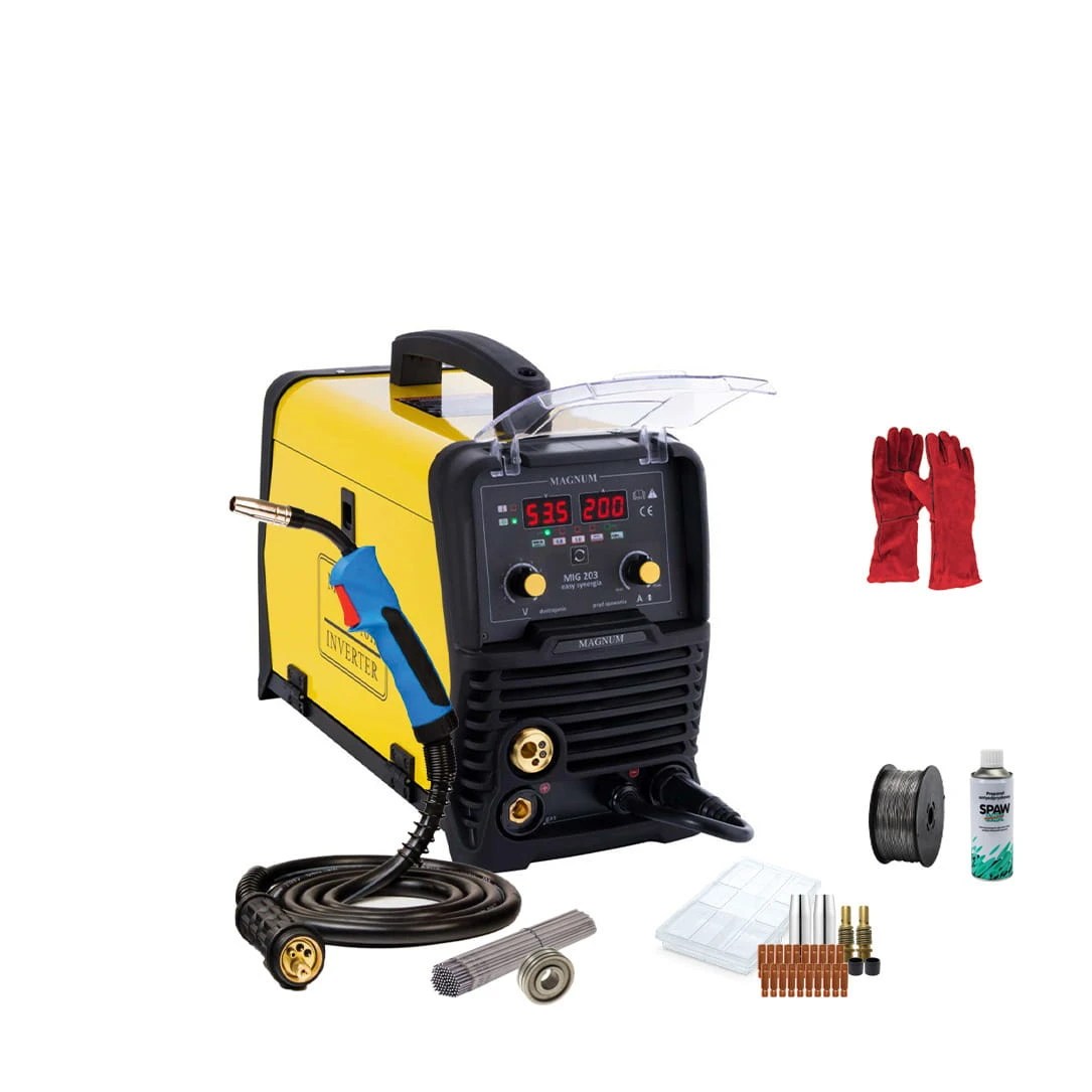 MIG 203 EASY SYNERGIA marki MAGNUM, to zawansowane technologicznie urządzenie spawalnicze z funkcją pełnej, prostej SYNERGII! Spawarka została stworzona z myślą o szybki i łatwym spawaniem. Wszystko jest zamknięte w solidnej i kompaktowej obudowie. Zaletą tego urządzenia jest także dodatkowa osłona panelu przedniego, która chroni panel sterowania przed uszkodzeniem.