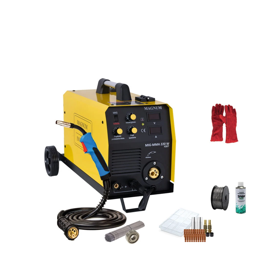 Urządzenie MAGNUM MIG-MMA 220W IGBT jest profesjonalnym półautomatem spawalniczym przeznaczonym do ręcznego, elektrycznego spawania stali niskowęglowej, niskostopowej (MAG), stali stopowych (MIG) oraz aluminium i jego stopów. Urządzeniem można również spawać metodą MMA z wykorzystaniem topliwych elektrod otulonych. Przeznaczony jest do wszelkiego rodzaju prac spawalniczych w warsztatach ślusarskich, warsztatach naprawczych, przemysłowych i fabrykach.
