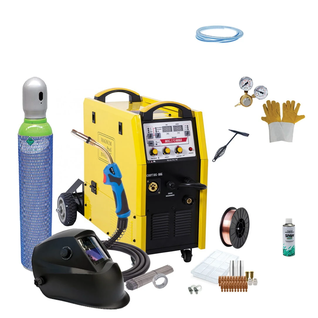 Urządzenie MAGNUM MIG 270 SYNERGIA to profesjonalny półautomat spawalniczy zasilany z sieci trójfazowej 400V o maksymalnym prądzie spawania 270A.