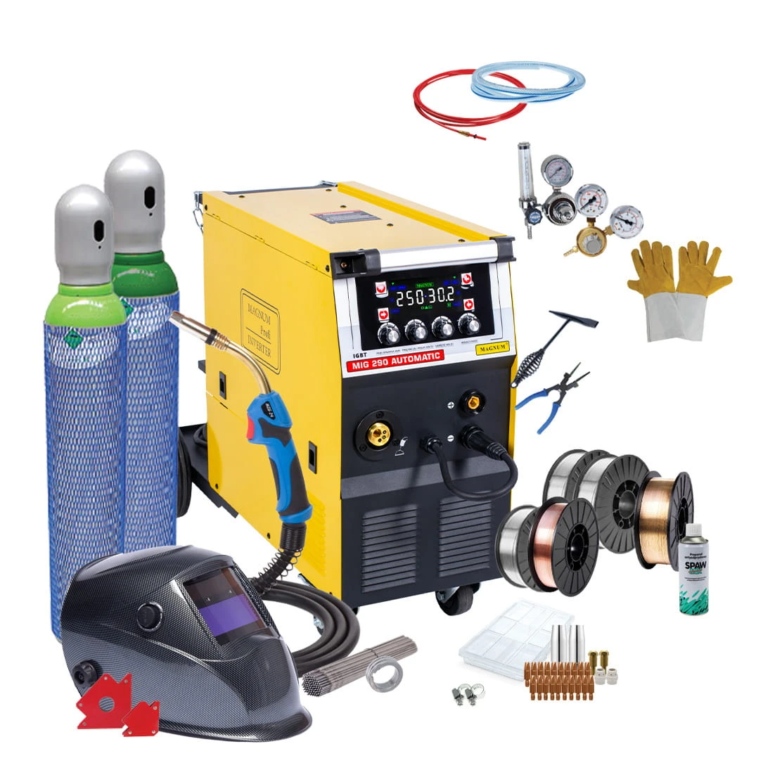 MAGNUM MIG 290 AUTOMATIC to profesjonalny inwerterowy półautomat spawalniczy pozwalający na spawanie MIG/MAG i MMA prądem maksymalnym 250A, Urządzenie wyposażone jest w profesjonalny podajnik drutu 4x4 i ma miejsce na szpule 15kg, co znacząco obniża koszty eksploatacji.