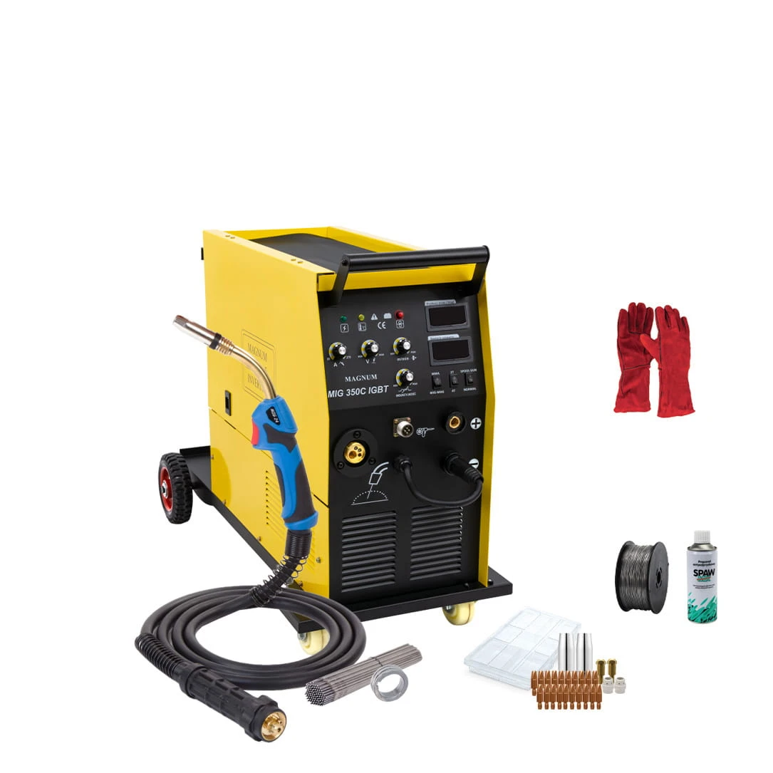 Urządzenie MAGNUM MIG 350C IGBT to profesjonalny półautomat spawalniczy zasilany z sieci trójfazowej 400V o maksymalnym prądzie spawania 350A. Oferowany półautomat wykonany jest w technologii inwerterowej, wyposażony w cyfrowy wyświetlacz prądu i napięcia spawania. Źródło prądu zostało zbudowane w oparciu o technologię wykorzystującą tranzystory IGBT, co przekłada się na zmniejszenie zakłóceń elektromagnetycznych, małe straty mocy, zwiększenie wydajności i niezawodności źródła prądu oraz wpłynęło znacząco na zmniejszenie zużycie energii. Wysoka jakość użytych podzespołów gwarantują długie i bezawaryjne użytkowanie.