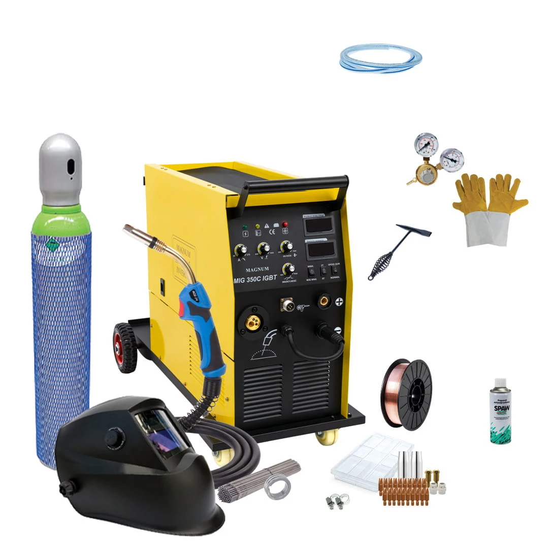 Urządzenie MAGNUM MIG 350C IGBT to profesjonalny półautomat spawalniczy zasilany z sieci trójfazowej 400V o maksymalnym prądzie spawania 350A. Oferowany półautomat wykonany jest w technologii inwerterowej, wyposażony w cyfrowy wyświetlacz prądu i napięcia spawania. Źródło prądu zostało zbudowane w oparciu o technologię wykorzystującą tranzystory IGBT, co przekłada się na zmniejszenie zakłóceń elektromagnetycznych, małe straty mocy, zwiększenie wydajności i niezawodności źródła prądu oraz wpłynęło znacząco na zmniejszenie zużycie energii. Wysoka jakość użytych podzespołów gwarantują długie i bezawaryjne użytkowanie.