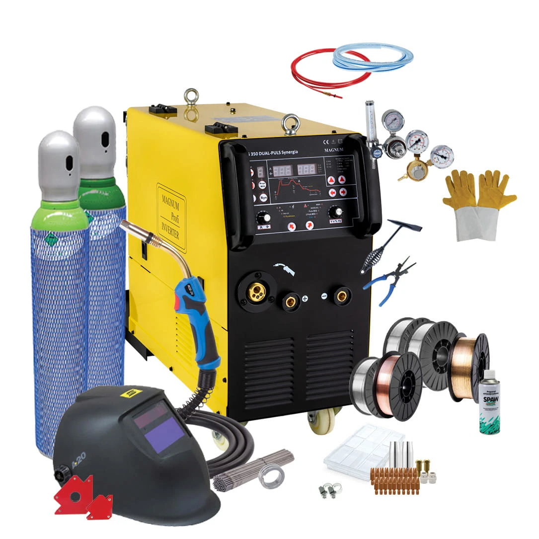 Urządzenie MAGNUM MIG 350 DUAL PULS SYNERGIA to profesjonalny półautomat spawalniczy zasilany z sieci trójfazowej 400V o maksymalnym prądzie spawania 350A. Spawarka MIG 350 przeznaczona jest przede wszystkim do spawania materiałów wykonanych ze stali nierdzewnej i aluminium a także stali niskowęglowych, niskostopowych, stali wysoko stopowych, miedzi.