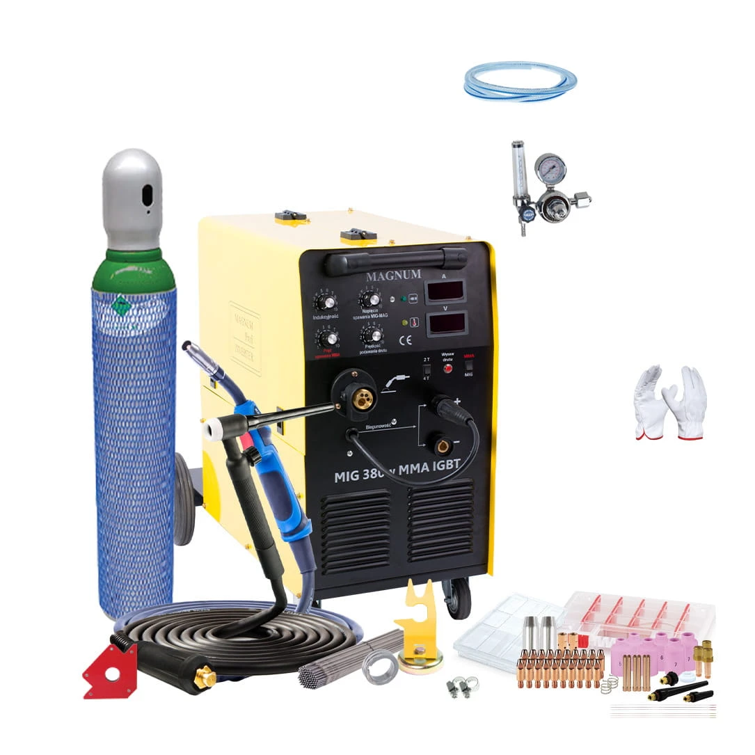 Urządzenie MAGNUM MIG 380w MMA IGBT to profesjonalny półautomat spawalniczy zasilany z sieci trójfazowej 400V o maksymalnym prądzie spawania 380A. Urządzenie umożliwia spawanie łukowe drutem topliwym MIG/MAG, drutem samoosłonowym FCAW (należy zmienić biegunowość w spawarce: minus (-) na uchwycie spawalniczym, plus (+) na masie!), oraz metodą MMA z wykorzystaniem elektrod otulonych (rutylowych, zasadowych, kwaśnych).