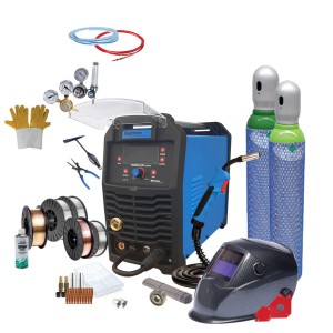 W komplecie znajdują się uchwyt MIG, przewód masowy i przewód elektrodowy.