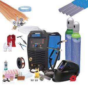 W komplecie znajdują się uchwyt MIG, przewód masowy i przewód elektrodowy.