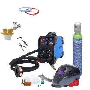 Spawarka wyposażona jest w zintegrowany uchwyt spawalniczy MIG, przewód elektrodowy oraz przewód masowy z zaciskiem kleszczowym.