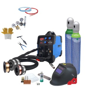 Spawarka wyposażona jest w zintegrowany uchwyt spawalniczy MIG, przewód elektrodowy oraz przewód masowy z zaciskiem kleszczowym.