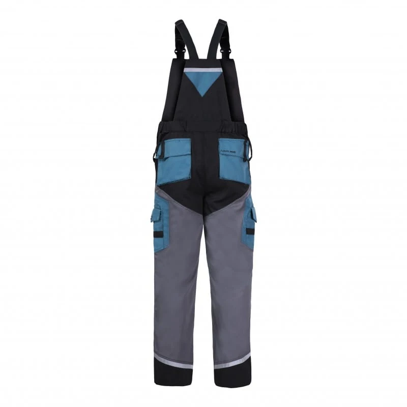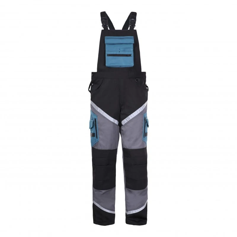 Są zapinane na zamek błyskawiczny i napy, a także mają regulowane szelki z klamrami. Spodnie są ozdobione odblaskowymi pasami na nogawkach i na piersi, co zwiększa bezpieczeństwo użytkownika w ciemności. Spodnie robocze ogrodniczki odblaskowe czarno-szaro-turkusowe Lahti Pro to spodnie, które łączą w sobie funkcjonalność, komfort i styl.