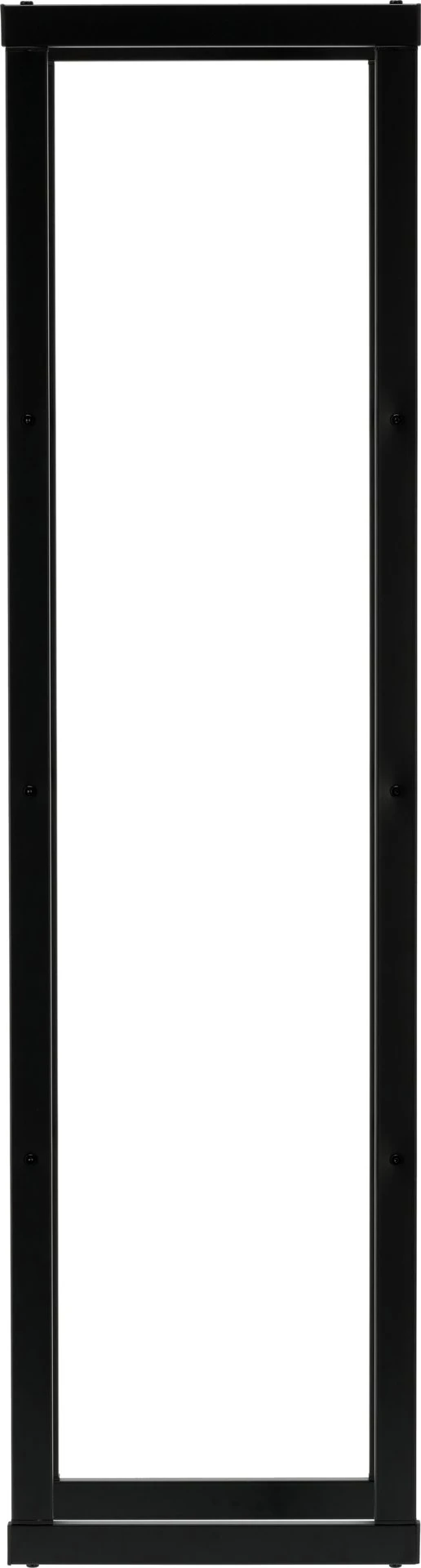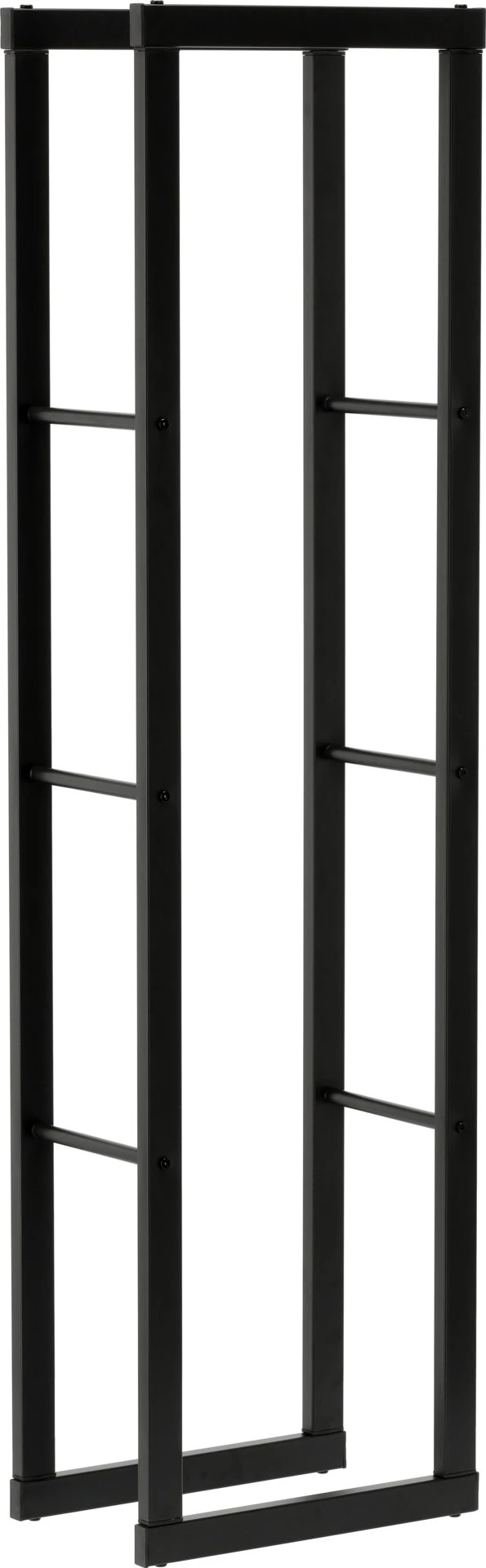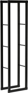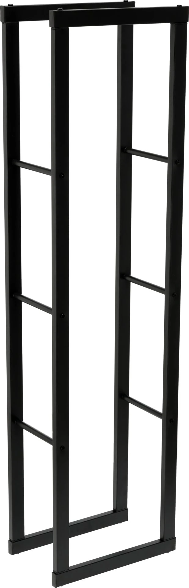 Otwarta budowa zapewnia swobodny przepływ powietrza, co wspiera naturalne dosychanie drewna i ogranicza ryzyko zawilgocenia. Stalowe profile malowane proszkowo na matową czerń zwiększają odporność na wilgoć, zarysowania i codzienne użytkowanie, a przy tym stojak pozostaje stabilny mimo niewielkich wymiarów.