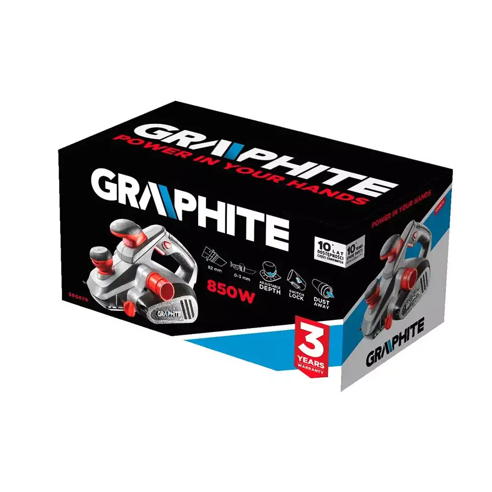 Elektryczny strug GRAPHITE (nr ref. 59G678) o mocy 850 W to praktyczne narzędzie do obróbki drewna, zaprojektowane z myślą o wygodzie i precyzji pracy. Nowoczesna forma oraz ergonomiczna konstrukcja ułatwiają prowadzenie urządzenia, a aluminiowa stopa zapewnia stabilność i odporność na odkształcenia.