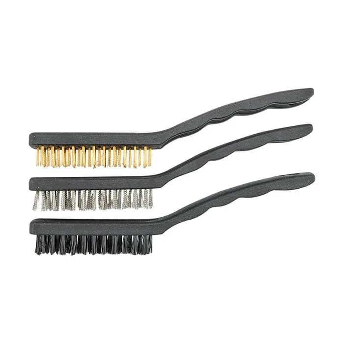 Zestaw trzech szczotek technicznych wykonanych z ocynkowanego drutu stalowego, drutu mosiężnego i nylonu. Korpusy szczotek wykonane z twardego tworzywa. Długość 170 mm.