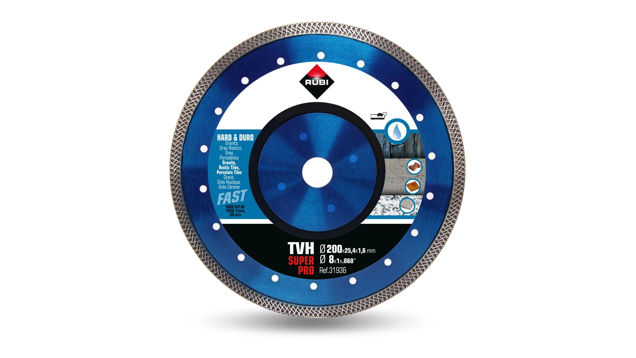 - Tarcza TVH przeznaczona jest do cięcia twardych materiałów: granitu, gresu rustykalnego, klinkieru, łupków i gresu porcelanowego.