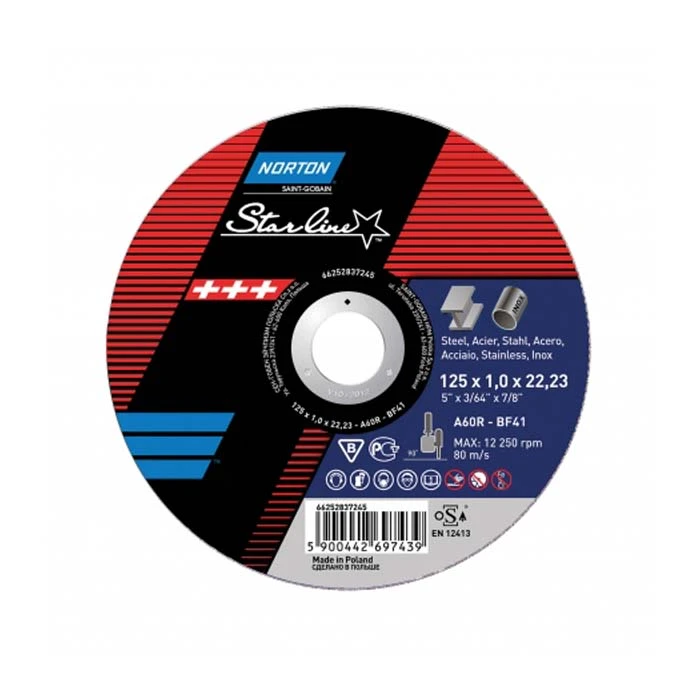 Norton Starline przedstawia kompletną i korzystną ofertę dla wszystkich zastosowań związanych z obróbką metali, z pełną gamą rozmiarów przeznaczoną dla szlifierek kątowych. Zapewnia dobre tempo usuwania materiału, szybkie cięcie, zmniejszony poziom drgań gwarantujący komfortową pracę oraz stałą wydajność dla uzyskania lepszej jakości części.