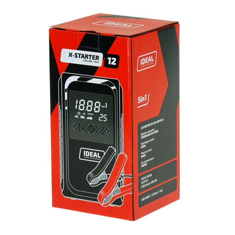 Ideal XSTARTER 12 LiPo Air 5in1 to nowoczesne, wielofunkcyjne urządzenie, które łączy w sobie funkcje rozruchu, kompresora, powerbanku, latarki oraz źródła zasilania 15V.