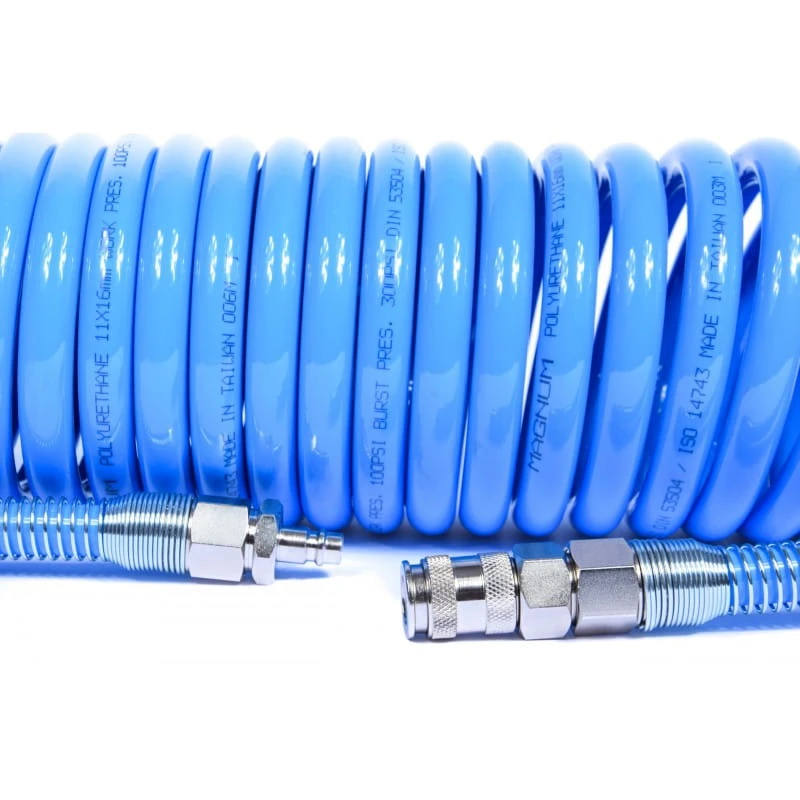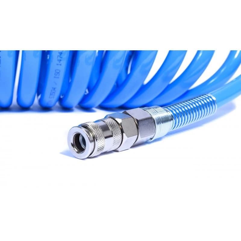 Poliuretanowy przewód spiralny przeznaczony do podłączania narzędzi do instalacji pneumatycznej. Wykonany z miękkiego, odpornego na ścieranie i zaginanie poliuretanu. Solidnie wykonany, zakuty w stalowe szybkozłącza o zwiększonym przepływie, kompatybilne z większością złączy. Posiadają proste odcinki końcowe, dzięki czemu żywotność końcówek jest dużo większa.
