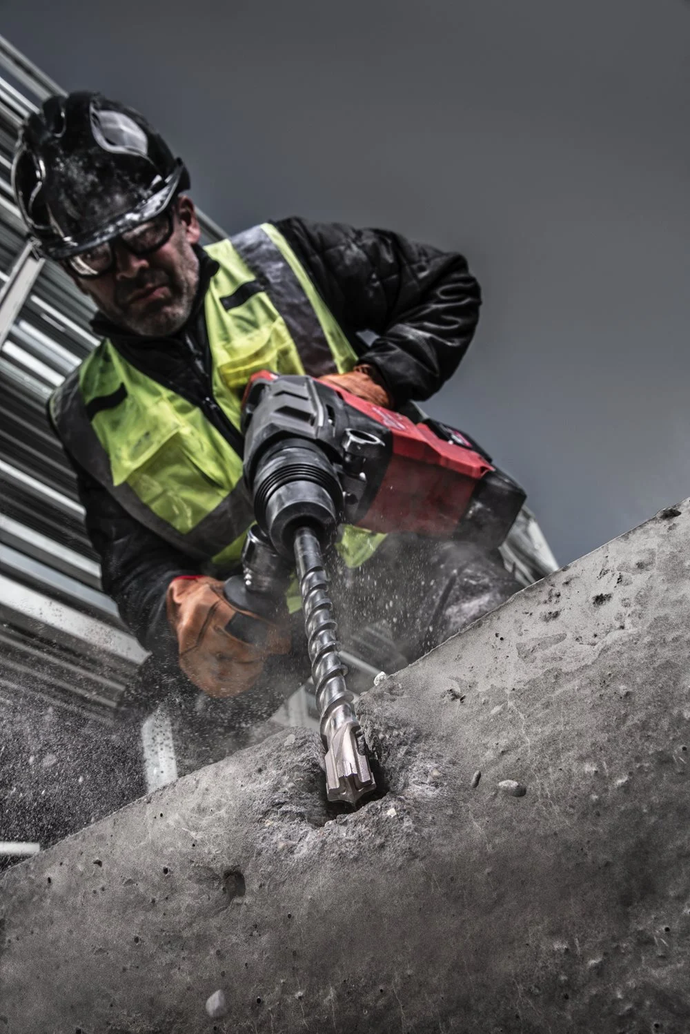- Duże ostrze z węglika z opatentowanymi skosami krawędzi. Zapewnia niższe wibracje i zoptymalizowaną wydajność wiercenia przy napotkaniu stali zbrojeniowej, co oznacza dłuższą żywotność.
