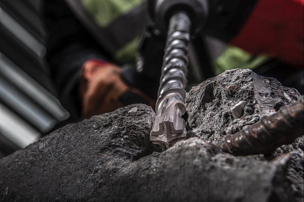 - Duże ostrze z węglika z opatentowanymi skosami krawędzi. Zapewnia niższe wibracje i zoptymalizowaną wydajność wiercenia przy napotkaniu stali zbrojeniowej, co oznacza dłuższą żywotność.