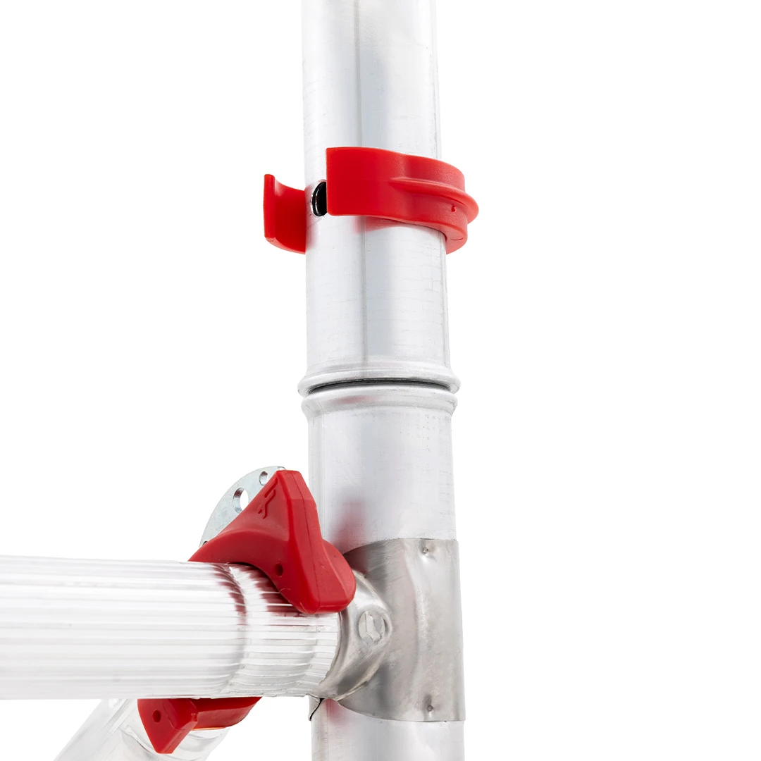 Faraone COMPACT XS to mobilna wieża jezdna (rusztowanie aluminiowe) zaprojektowana do bezpiecznej i wygodnej pracy na wysokości w zastosowaniach budowlanych, malarskich, konserwacyjnych i instalatorskich. Wersja COM180XS.ABC (zestaw 20-elementowy) to rozbudowana konfiguracja o większej wysokości roboczej, wyposażona w komplet elementów poprawiających stabilność i bezpieczeństwo, w tym poręcze, bortnice, stężenia ukośne oraz stabilizatory.