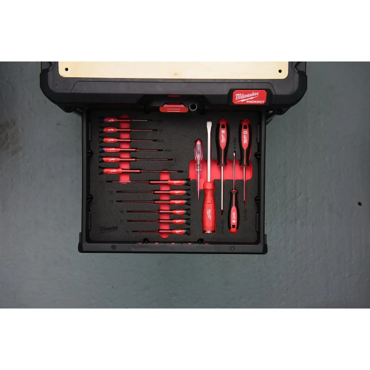 - Wysokiej jakości pianka zapewniająca dłuższą trwałość, laserowo grawerowane rozmiary dla łatwej i szybkiej identyfikacji rozmiaru oraz czerwone tło do szybkiej identyfikacji brakujących narzędzi.
