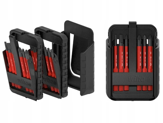 W konwencjonalnych wkrętakach dla elektryków, średnica trzonka jest często zbyt duża, aby dotrzeć do głęboko położonych śrub. Usuwanie izolacji z wkrętaka jest jednak zabronione i zagraża Twojemu bezpieczeństwu. Wkrętaki przeznaczone specjalnie dla elektryków, wykonane w technologii slimTECHNOLOGY opracowanej przez firmę Wiha, posiadają izolację ochronną zintegrowaną z trzonkiem, którego grubość jest zredukowana o 33%. Dzięki bitom slimBit mamy łatwy dostęp do głęboko położonych elementów śrubowych i sprężynowych. Izolowane bity slimBit poddawane są kontroli jednostkowej zgodnie z międzynarodową normą IEC 60900 i umożliwiają bezpieczną pracę w obszarze pod napięciem do 1000 V AC. Bity slimBit są schowane w dwóch połączonych kasetach na bity, które zapewniają optymalny wgląd w profile śrubowe. Dzięki dołączonemu zaczepowi na pasek, kasety na bity slimBit są idealnym towarzyszem do użytku mobilnego. Bity slimBit 6 mm przeznaczone są wyłącznie do stosowania w narzędziach speedE®, slimVario® lub TorqueVario®-S electric.