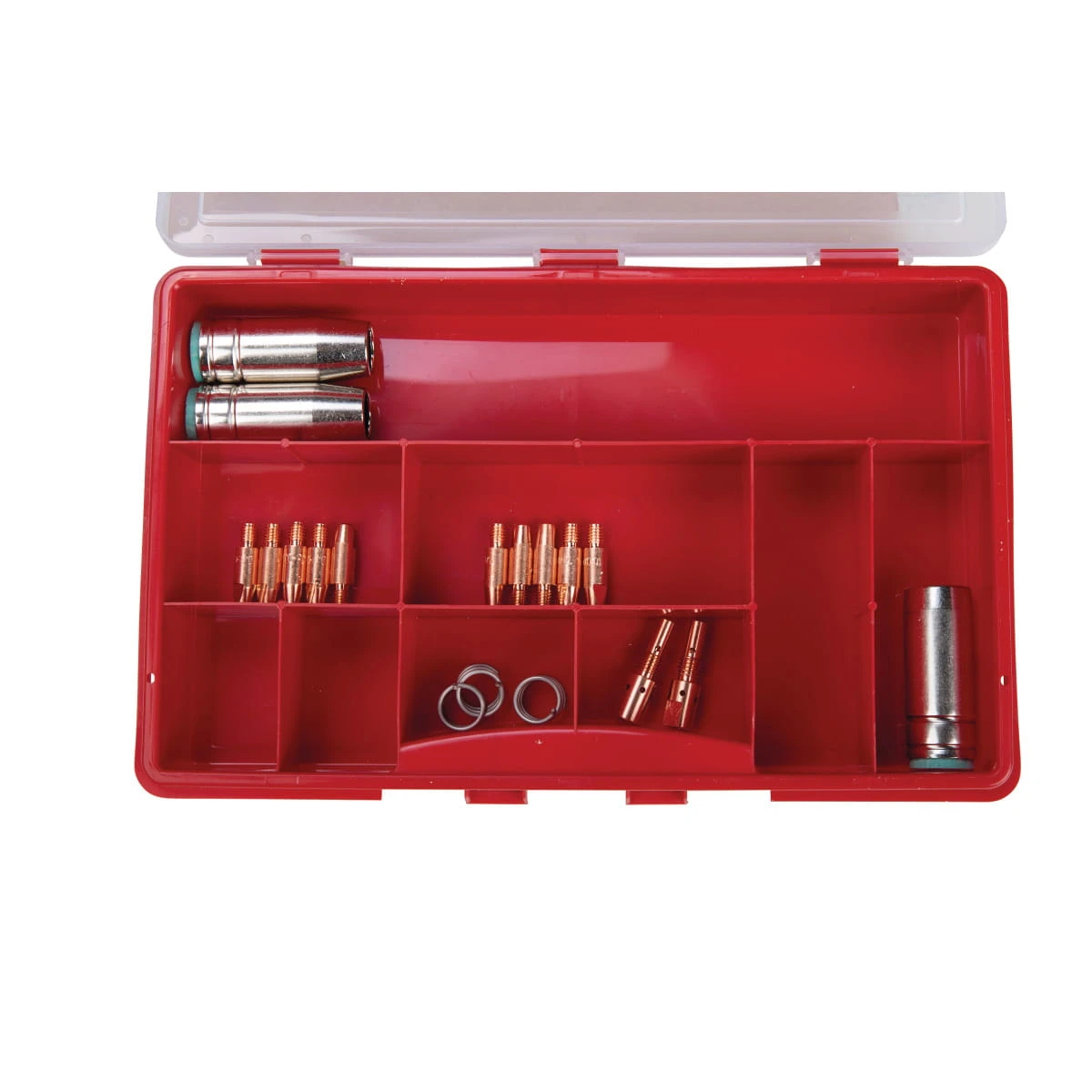 - Kompletny zestaw części zużywalnych do palników MIG-MAG SMB 25 i MB 25 przejrzyście posegregowanych w pudełku z tworzywa sztucznego