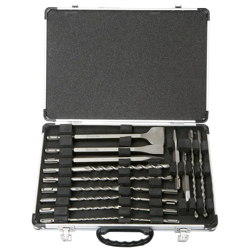 Zestaw wierteł i dłut SDS-PLUS do pracy z betonem. Długość całkowita tych wierteł wynosi 540 mm, a średnica 18-25 mm. Długość punktaków i dłut wynosi 140-250 mm. Średnica dłut wynosi 20-40 mm. Opakowanie zawiera 12 wierteł, 2 punktaki, 2 dłuta płaskie i 1 dłuto do skuwania w aluminiowej walizce.