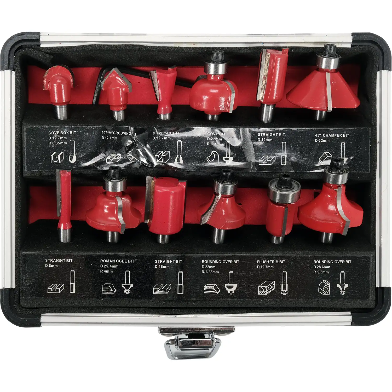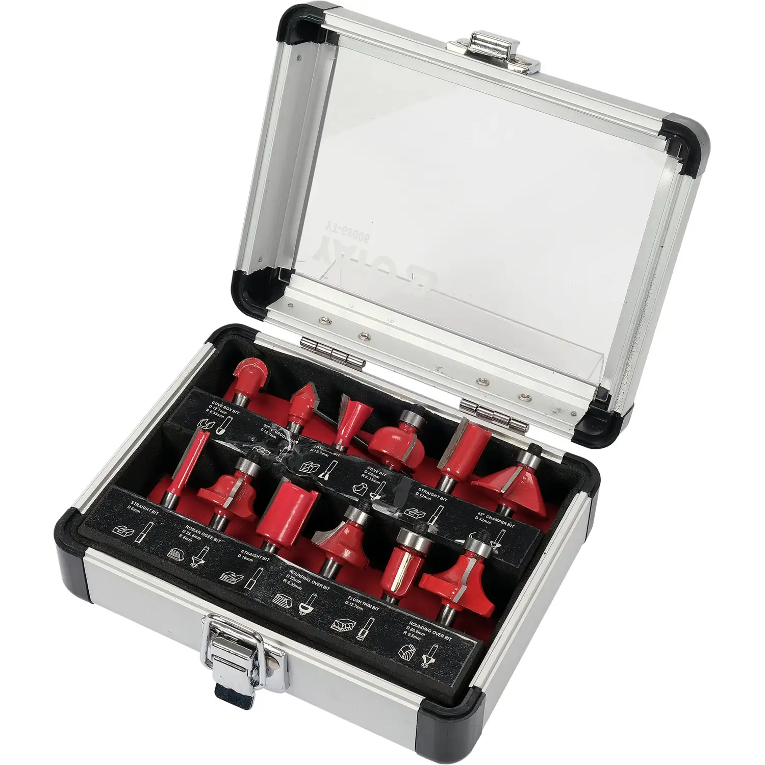 Zestaw 12 frezów trzpieniowych przeznaczonych do precyzyjnej obróbki drewna za pomocą frezarek górnowrzecionowych.