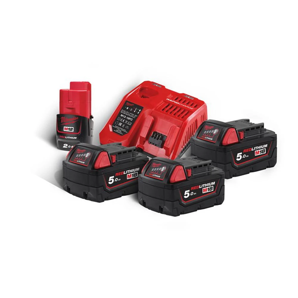 - Zestaw zawiera także trzy akumulatory M18™ o pojemności 5.0 Ah, które zapewniają długi czas pracy i wysoką moc. Dodatkowo, w zestawie znajduje się gratisowy akumulator M12™ o pojemności 2.0 Ah, który pasuje do ponad 80 subkompaktowych narzędzi Milwaukee.